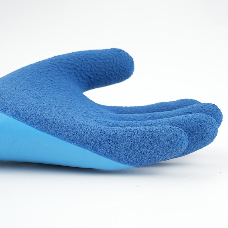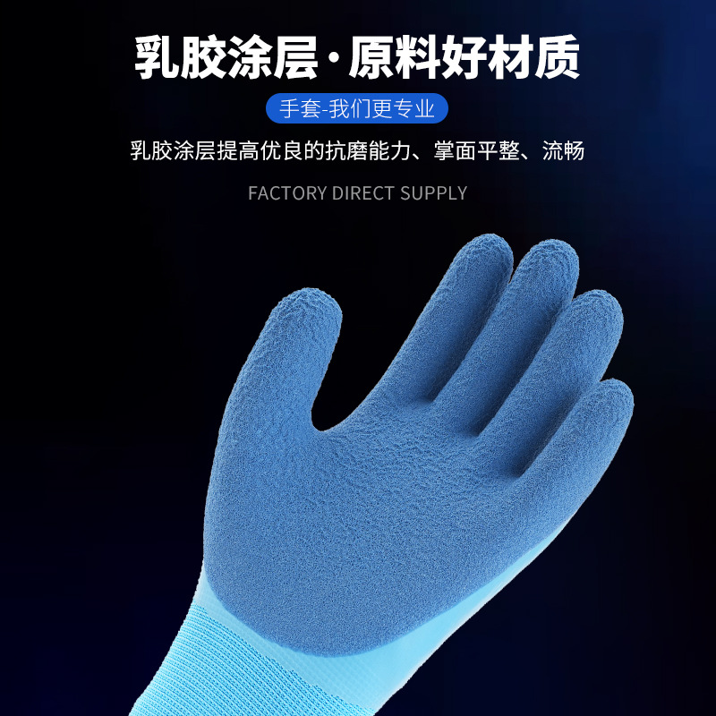 开司米绒蓝色乳胶超细皱纹冬季加绒保暖防水手套双层内里劳保手套