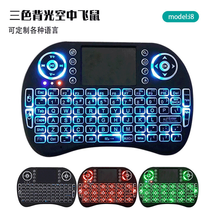 工厂直销i8飞鼠干电锂电三色背光 2.4G空中遥控无线迷你便携键盘