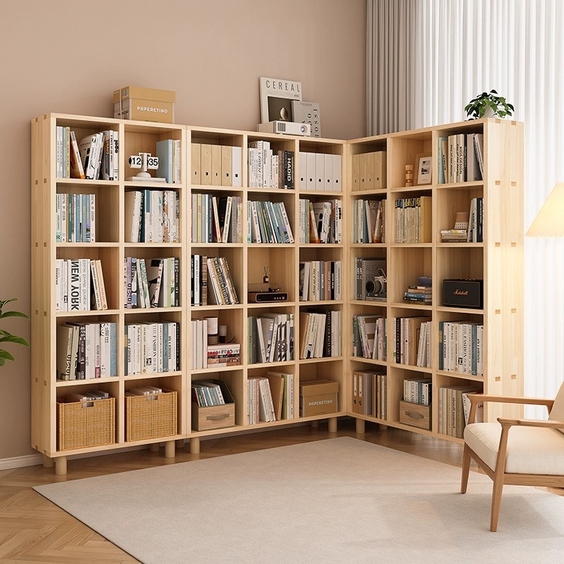 转角书柜置物架全实木简约书架家用客厅一体靠墙展示柜