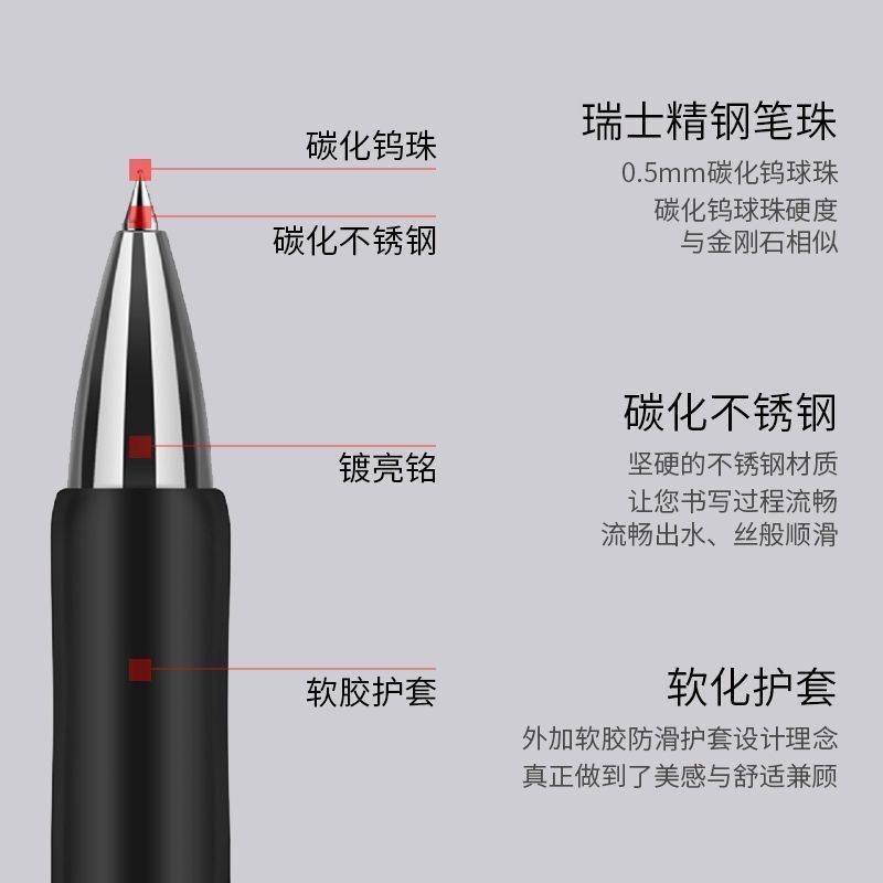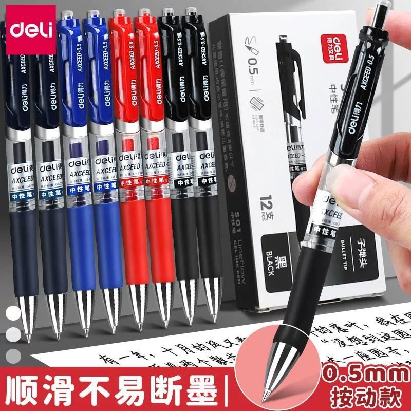 得力S01按动中性笔学生经典黑色签字笔0.5碳素子弹头办公刷题笔红
