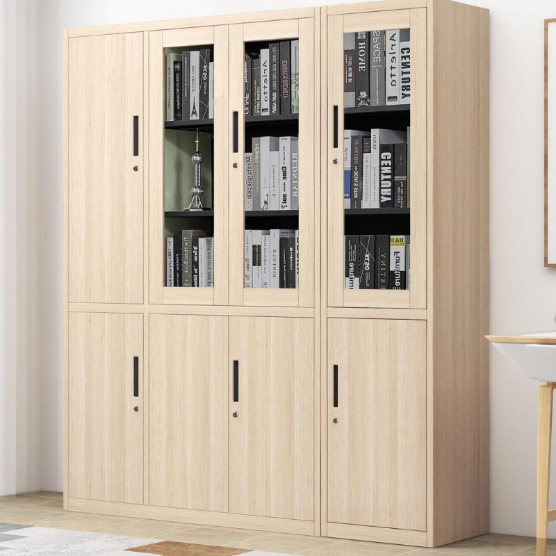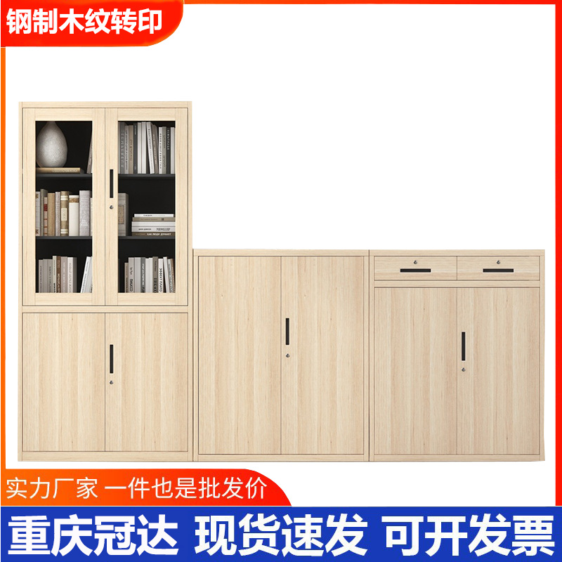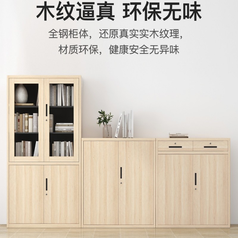 办公室文件柜木纹转印钢制铁皮柜资料档案柜书柜带锁玻璃矮柜储物