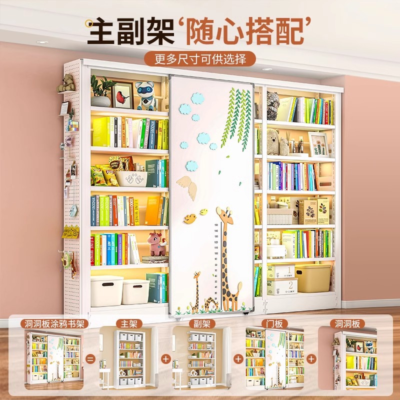 家用图书馆钢制书架带白板门多层收纳置物架落地一体靠墙防尘书柜